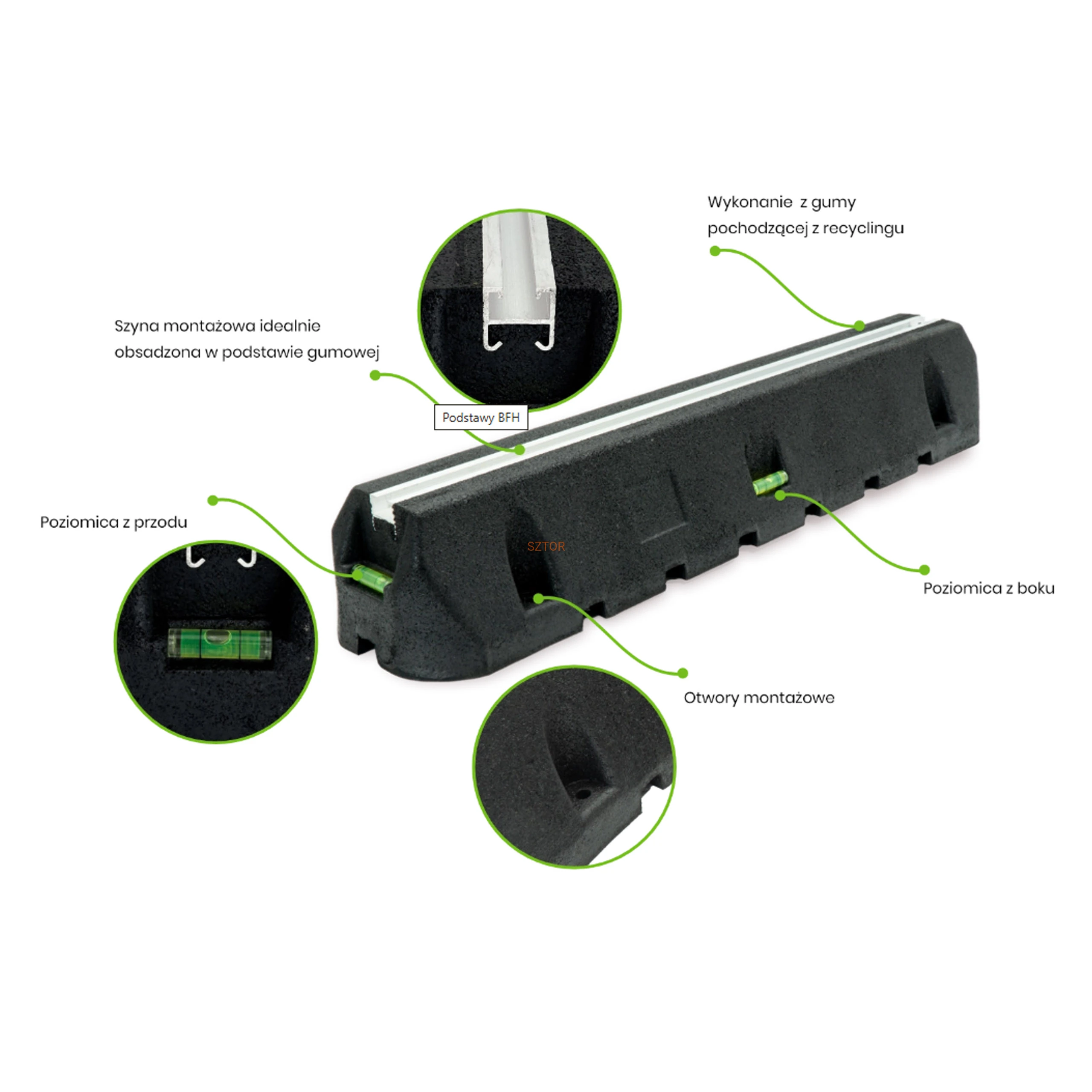 Podstawy wyposażone są w otwory montażowe, które umożliwiają stabilne przymocowanie do podłoża – fundamentu, kostki lub bloczka betonowego. To gwarancja bezpieczeństwa nawet przy intensywnej pracy urządzenia (zestaw nie zawiera kotew montażowych).